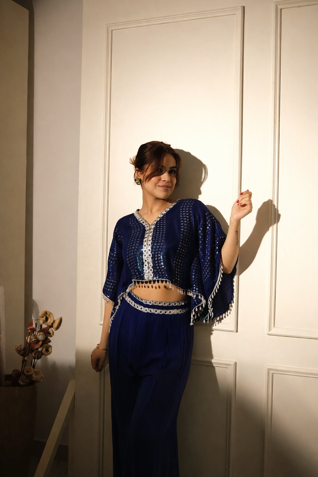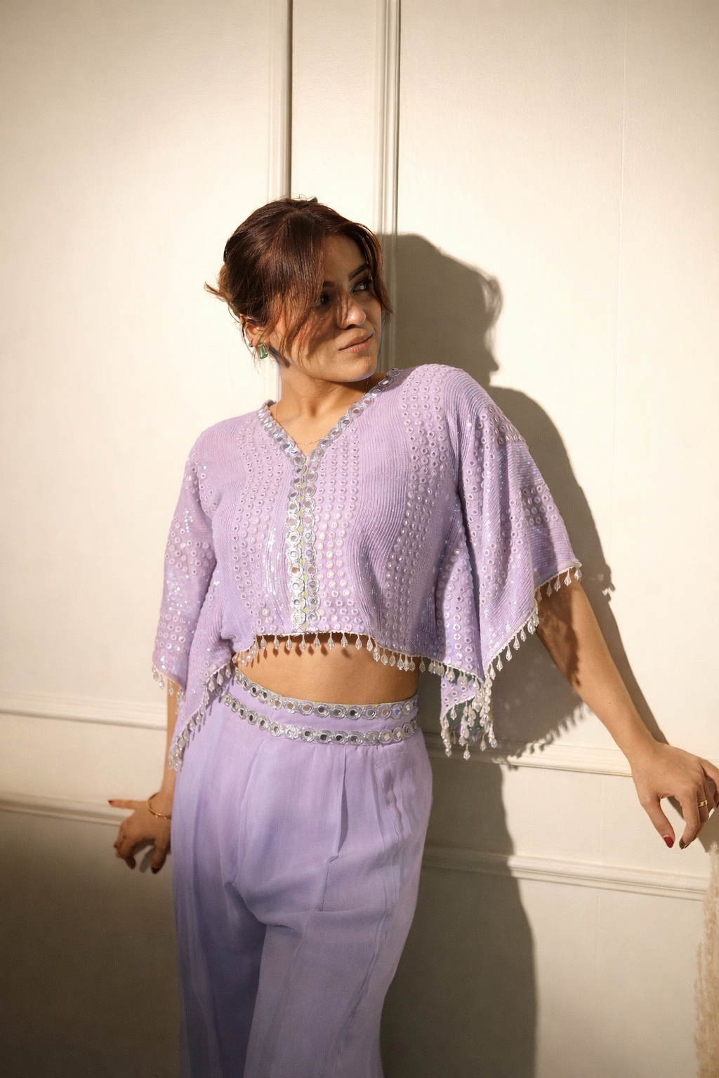 Turn heads in our Lime Light Mirrorwork Coord Set, designed for women who love to shine—literally. This striking two-piece set features a cropped, mirror-embellished cape-style top paired with flowy high-waisted pants in a refreshing lime green hue.