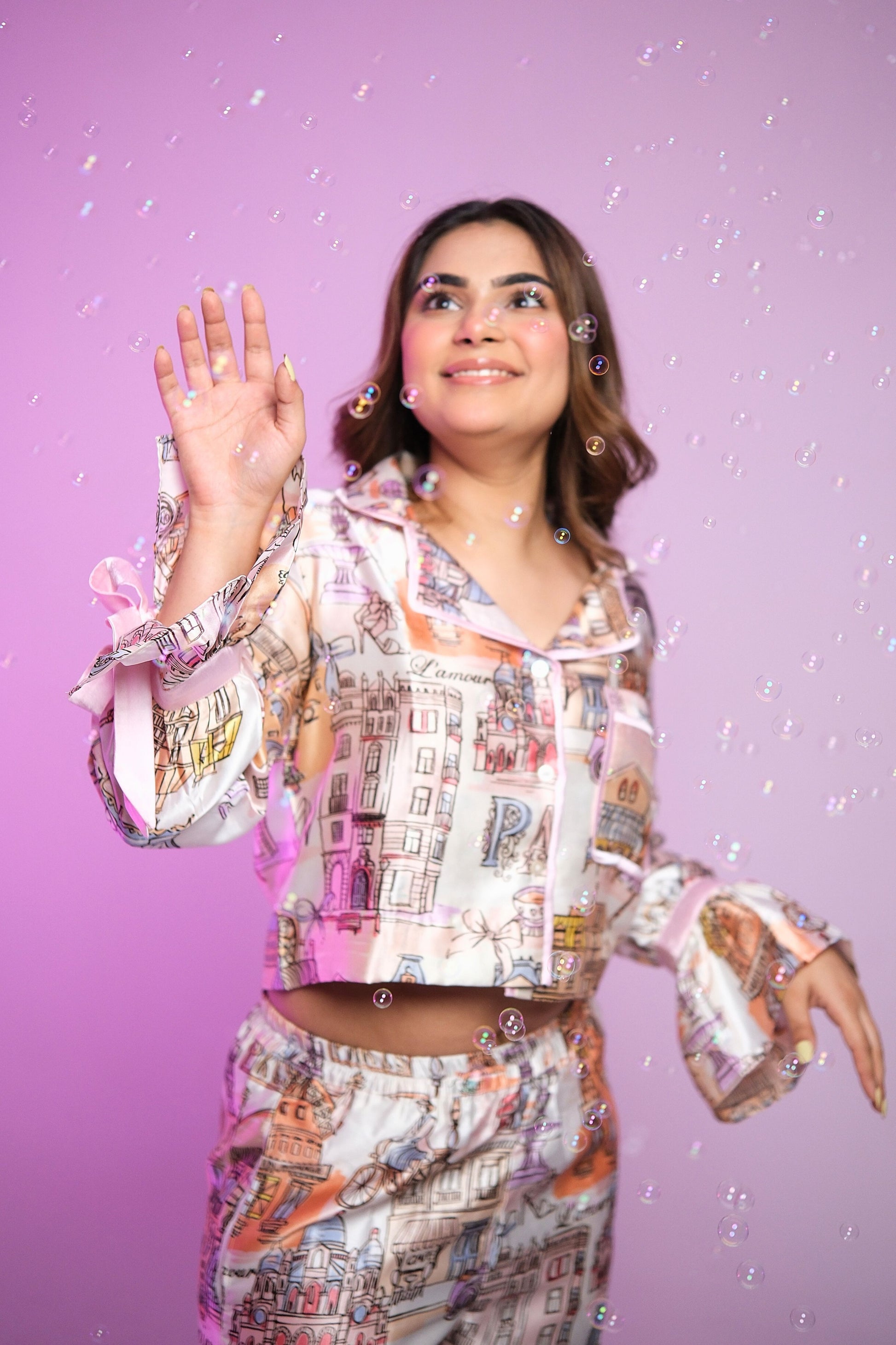 Wake up in the city of love — without leaving your bedroom. The Bonjour in Paris – PJ Lounge Set is a whimsical ode to Parisian charm, featuring hand-drawn cityscape prints of the Eiffel Tower, cobblestone streets, and romantic architecture in a pastel palette. Crafted from a buttery-soft fabric, the top boasts playful bell sleeves with delicate bow accents, adding a touch of feminine flair. The matching pajama pants promise comfort and ease, making it perfect for leisurely mornings, cozy nights, or simply daydreaming about your next Paris getaway.