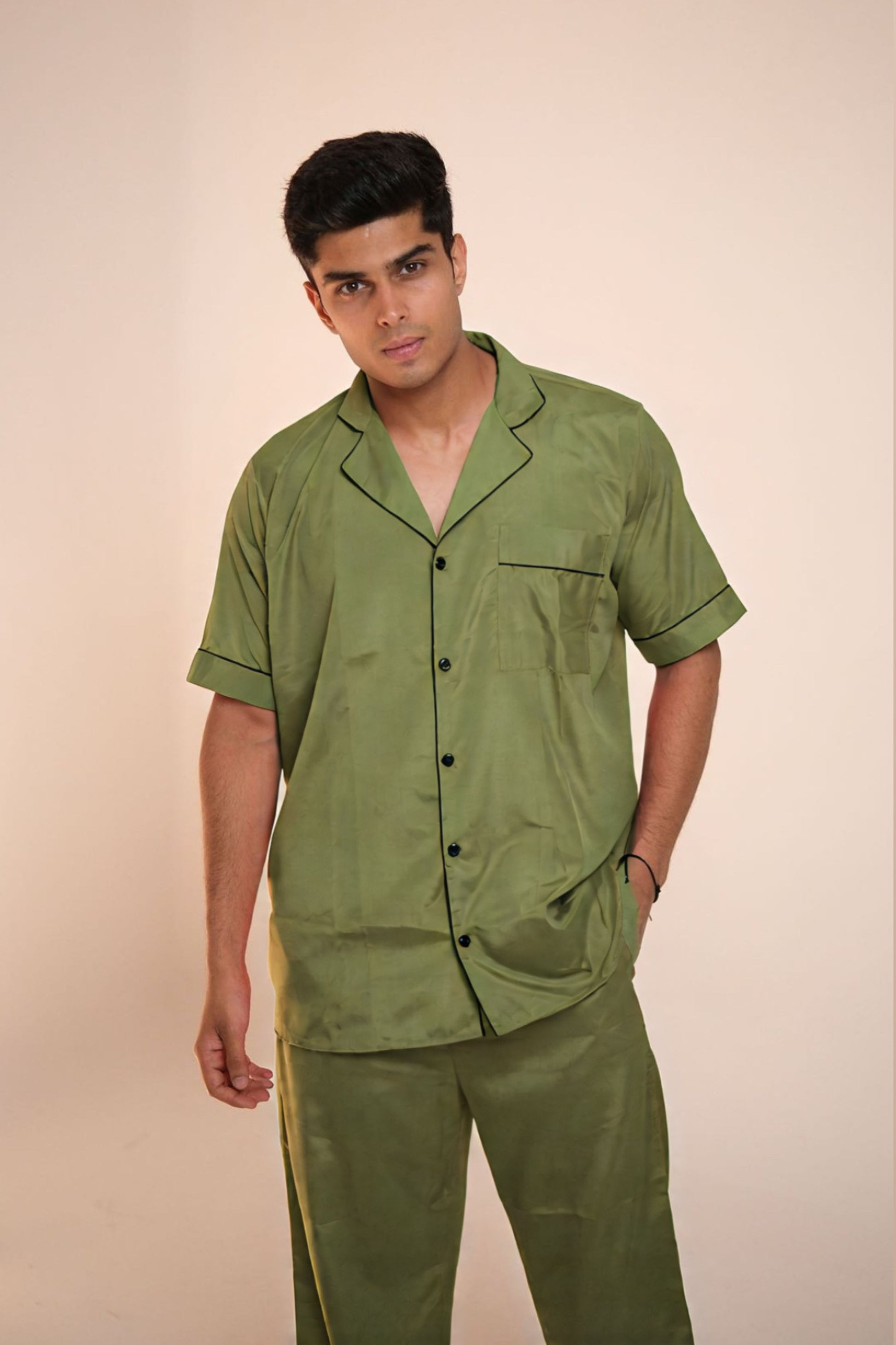 Unwind in effortless style with our Weekend Vibe – Men's Pajama Lounge Set, crafted in breathable, lightweight crepe for all-day comfort. The crisp collared shirt with black contrast piping adds a sharp touch, while the short sleeves keep it cool and relaxed. Paired with straight-fit trousers featuring an easy elastic waistband, this set is perfect for lazy mornings, movie marathons, or winding down after a long day.