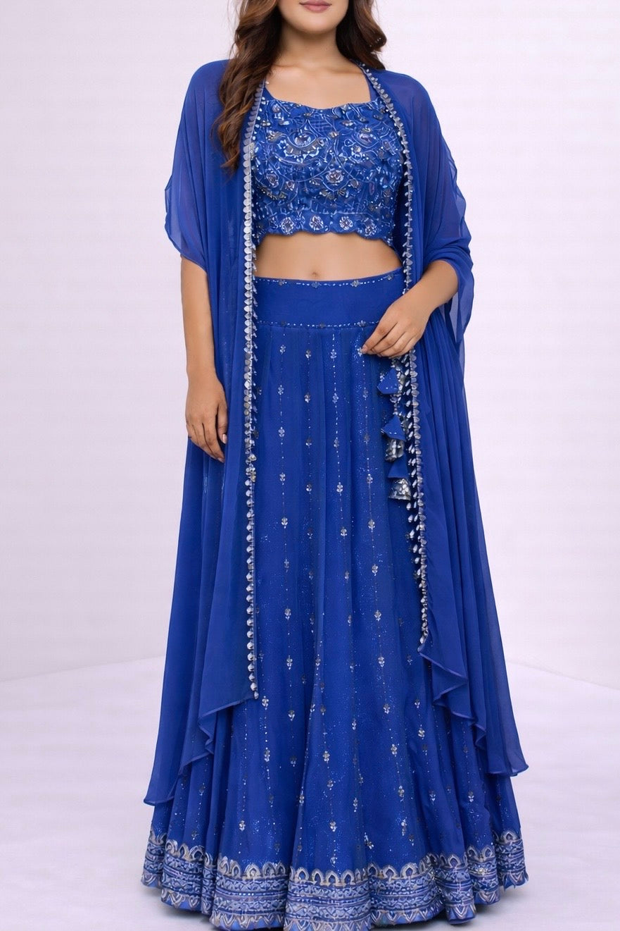 Meher – Hand Embroidered Scallop Georgette Lehenga with Cape